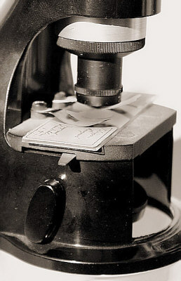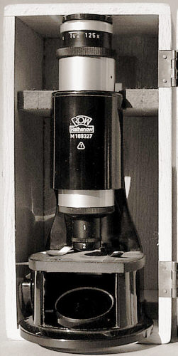 This photomicrograph can be compared with the images taken through other microscopes (cf. articles about the Tami Microscope here in Micscape and "30 g of microscope, please"). You will notice that the ROW school microscope performs not quite as well as the Tami microscope, which is no surprise when keeping in mind that the Tami was intended for professional use and had a professional price (a half month's workman salary). Those who are able to read in German language might like to look at the original instructions for the pupils which explain the basic functions. As there are only a few knobs to turn and to play with, the pupils will be able to concentrate on the microscopic subject and not become addicts to beautiful brass substage fine mechanics.