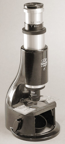 This article is intended to continue the Micscape series about unusual and small microscopes. This time we have a look at (and through) a school microscope, called "Kleinmikroskop B" produced in the eastern German town of Rathenow at the time when East and West Germany were two independent states. The last instruments of the type shown were produced in 19651. They have been replaced by a similar small portable low-cost microscope with draw-tube which is being produced in Rathenow up to the present day.