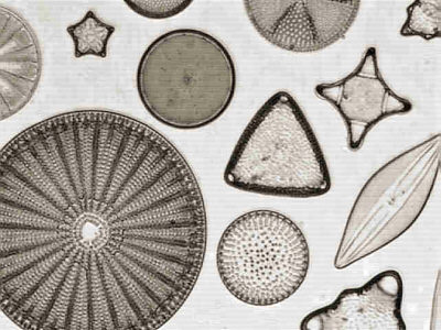 The single achromatic objective (ca. 13x) looks similar to good standard microscope optics though it has no RMS thread. It performs quite well. The eyepiece (about 15x) has glass lenses in a housing of plastics and aluminium. The aluminium optics tube has a thread on the outer side which doesn't move in a counter thread but instead in a piece of felt! This is obviously due to cost or material constraints and makes fine focusing difficult. Furthermore small felt fibre particles from time to time tend to fall down on the slide under investigation. Nevertheless the overall optical performance is quite ok and far above the level of modern toy microscopes. The image below (fig. 6) has been taken through the objective of the ROW Kleinmikroskop B at full magnification. The large diatom on the left measures 200 µm.