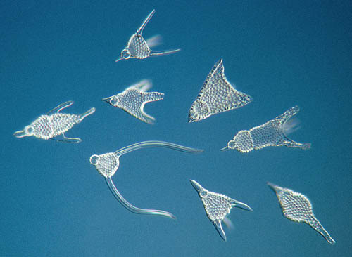 These two images of fossil radiolaria and sponge spicules from Barbados show the slight differences between this filter technique and Nomarski. I don't remember which one was taken with the new filter set but I think the one with slightly more 3D effect is the Nomarski. Or was it the other one :-) . |