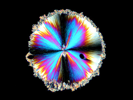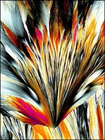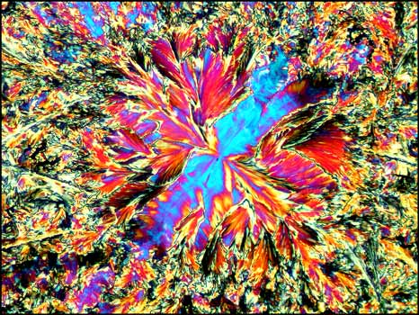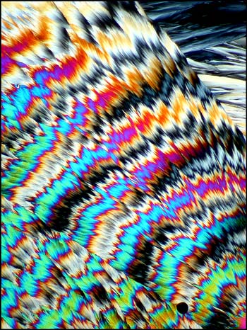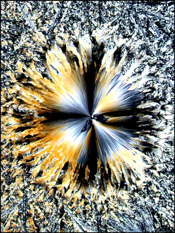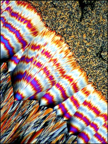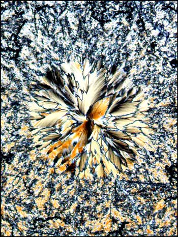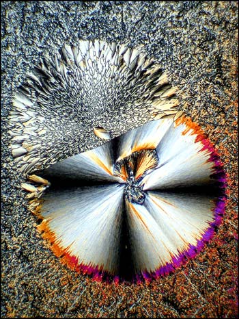For the final image in the article, I have chosen the photomicrograph below, because it is so unlike all of the other hippuric acid examples. Just when one is confident in identifying this compound under polarized light, up pops the devil! This unusual pattern, that reminds me of liquid crystal melt specimens, is in fact, hippuric acid. It is this never knowing what to expect next, that makes the photomicrography of crystals such an exciting field of study! I hope that the images of hippuric acid in this article will entice you to have a closer look at this fascinating compound!