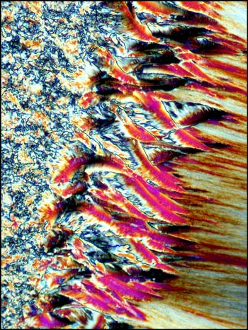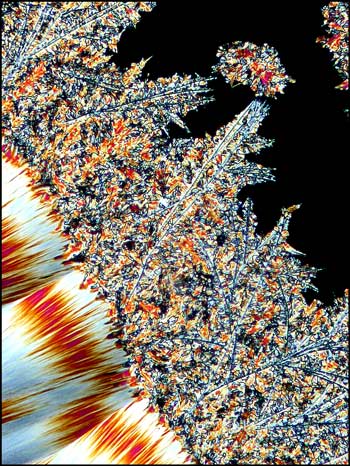 The final characteristic formation in hippuric acid melts that I wish to illustrate, is the strange "feathered" edges of both spheroliths and fan structures when viewed at higher magnification. I have not seen similar feathering of edges in any of the other hundreds of compounds that I have photographed. (The different colour-scheme of the two images is due to a difference in crystal thickness in the melt specimens.)