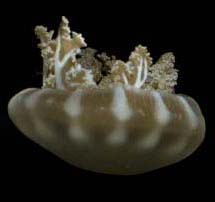Geographic Range: Indo-Pacific Oceans, also common around Florida and West Indies Habitat and Behavior: The upside-down jellyfish lives in the sandy mud-flats of shallow water (up to 5m depth). It lies upside-down, anchored on the shallow ocean bottom. While anchored its bell pulses to drive water currents through, carrying respiratory gases and food. The adult upside-down jellyfish rarely swims. They are invertebrates and their bodies are 95% water, 3% salt, and 2% protein. Symbiotic algae living in the jellyfish's body produce oxygen; this allows the jellyfish to survive in oxygen-poor water. |