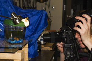 In attempting to photograph my apple snails, I ran into a few problems. First off, the tank I purchased to house my tiny friends is made of plastic; not the ideal media to photograph through. Being short on funds, I couldn't buy a glass tank nor could I make a large water cell. I tried several different glass containers but most glass is blown with a thickness change throughout. Thickness changes cause distortion, making it difficult to get good focus. So I decided to just use the tank I already had. I have included two examples of what can go wrong when you are photographing through plastic with scratches and curved corners. My setup, pictured above, included two small tungsten lights angled down through the water (a polarizer could be used to reduce reflections). To get the most photographs, shoot late in the day as apple snails are the most active during that time. Although snails appear to be slow moving creatures, a hand-held flash unit is needed to freeze motion (when placed under lights, a snail’s pace is quite fast). I recommend taking lots of images with different exposures but be sure to diffuse your flash (I used the built-in diffuser on my flash) and hold the flash off at an angle from above. Doing so will reduce the amount of glare off the surface of the tank and can improve your overall image quality. If you hold the flash off at an angle you can almost make the surface of the tank disappear, reducing the amount of work you need to do in Photoshop.