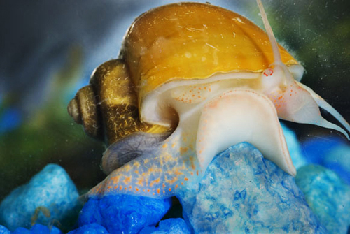 The spike-topped apple snail, Pomacea bridgessii, is an algae eater but when their environment lacks algae they will eat soft vegetation. Fish flakes, rotting plants or algae wafers are recommended food sources. The shell of the apple snail is made up of calcium, which the snail must obtain from the water. If the water is deficient in calcium the shell will start to form holes; to prevent this from happening it is recommended that liquid calcium be added to your tank. Clean water is not as important for a snail but is recommended if you don’t want your tank to smell. When changing the water of your tank, be sure not to use tap water that contains copper or other metals as the apple snail is very sensitive. Tank size is also important; it is recommended that you allot 2.5 gallons per snail. Keeping the tank covered is very important, if there is no cover or large opening in the cover then the snails can leave the tank. Apple snails can be purchased at most pet stores that carry fish or a pond supply stores.