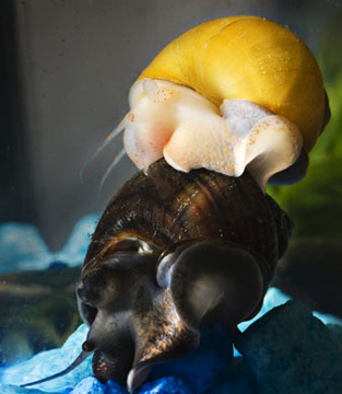 Piggy backing - Golden snail feasting on algae from shell of black snail |