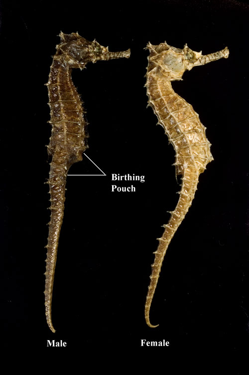 The crown of the seahorse head is known as the coronet, and is almost as distinctive as a human thumbprint. The seahorse has a dorsal fin located on the lower body and pectoral fins located near the gills on its head. The dorsal fin is a small appendage that helps move the seahorse forward. The turning and side to side movement is controlled by the pectoral fins. The eyes of the seahorse are interesting because each eye moves independently of the other. The size of a seahorse can range from a quarter of an inch to a foot or more depending on the species.Male or Female?