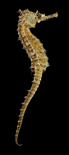 Unfortunately the beautiful colors and the difference in male and female genitalia could not be clearly represented, as I was only able to use dried scientific specimens. However you are still able to observe some basic seahorse anatomy and qualities. I photographed the dried seahorse specimens in lab with 105mm macro lens and a 38mm thimble lens using bellows. I lit the specimens with fiber optic lights and took exposures of 1 sec and higher. My camera was mounted to a copy stand and tethered to a computer to decrease vibration.Sources