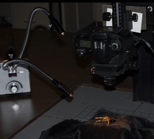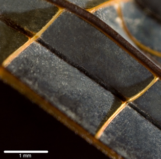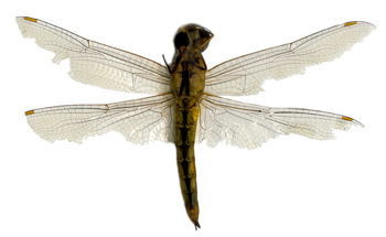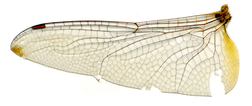 Using a fiber optic light source and a NikonD70 camera with Nikon bellows and a 38 mm thimble lens attached via USB cord to a Macintosh computer with Nikon Capture software as a set-up; I shot the specimens. Due to the upcoming winter season, my methods to capture live dragonflies proved fruitless, but I was able to obtain several specimens of preserved Aeschnidae Odonata from Wars's Natural Science located in Rochester, New York. The Odonata were kept in a 24% ethanol solution called grasshopper juice. To capture the veination in the thin membrane of the wing, I used side-lighting to prevent refraction off the wing surface. Also used during this project was an Epson Perfection 4870 scanner; the pictures on this site with the white backgrounds were produced from this piece of equipment. A labjack was used to raise and lower the specimen into focus; a black cloth was used to absorb reflections. Due to the fragile nature of the specimens, tweezers were used during most handling times. An exacto-knife was used to dissect different parts of the dragonfly and a petri-dish filled with water was utilized to prevent the specimen from drying out.