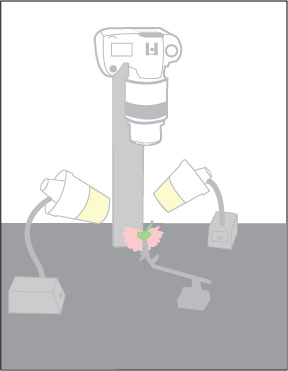 A Nikon D70 camera was used in all of these images. Using both 60mm and 105mm macro lenses provided edge to edge sharpness when photographing these flowers. To obtain a more magnified images, especially when shooting the males stamen, Nikon bellows and a 38mm thimble lens was used. Two Tensor lights with styrofoam cups for diffusion were used for lighting. One light was placed on either side of the flower in order to crate uniform light over the entire flower (see diagram to the right). Exposure times ranged anywhere from 10 seconds to 1 second depending on which magnification being shot. Third arms and modeling clay were used to keep the flower in place. A copy stand held the camera above the flower and helped to minimize vibration.