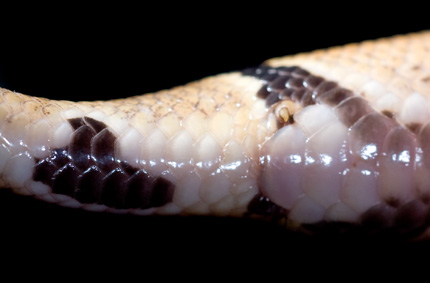 The head is one of the most complicated areas of these snakes. Ball Pythons are ambush predators, able to lie in wait for days waiting for prey to wander by. Like all snakes these Pythons have a forked tongue that allows them to “taste the air.” Snakes such as the Ball Python also have a set of functioning nostrils. Located below the nostrils and highlighted by the white line, are a series of pits known as heat pits. There are four on each side of the mouth. These pits allow the snake to “see heat.” Ball pythons hunt by tracking heat signals that their prey gives off.