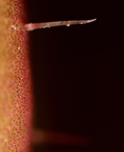 SET UP: The first set up is putting the plant on the labjack with a camera and handheld flash ready while on a tripod. A 105mm macro lens was used to achieve close up images. A black backdrop was used to isolate a background image. The second set up involves using a camera and 55mm lens with a bellow between for higher magnification. This allowed the photographer to achieve even closer up images such as the trigger hairs. Tensor lamps were used to keep the plant warm and to enhance the red pigment. The most challenging part in both set-up while photographing the subject was getting good lighting inside and out, and without casting unpleasant shadows. EQUIPMENT: