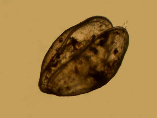 Method 2: This is the method I prefer, because I am congenitally lazy. I bring my pint jars stuffed with aquatic vegetation back to my lab, take off the lids and let them ripen (and ripen they do–after a few days one needs a gas mask). There are several advantages to this method. First of all, you can often find a few ostracods swimming around on the sides of the jar or near the surface and having now perfected your fast pipet technique, you can capture a number of them. After 3 or 4 days, a thick brownish scum starts to form and so now, you begin to get added value. Last week, I collected some samples and 2 of them were just like this. Today I looked at a couple surface scum samples and in the first, I found Paramecia (of course!–wonderfully reliable critters), two species of hypotrichs, another small ciliate, and lots of other extremely wee beasties that require at least 1000x to see any detail. However, the important thing is that if you sample the bottom before it gets too utterly vile, you can often find numbers of dead ostracods, sometimes with the valves open revealing the critters, this being a consequence of asphyxia. Or if you take the samples outside and use a pair of tongs or long forceps to remove the vegetation you then can add some tap water and allow it to sit until it semi-purifies itself. Then after a couple of such rinses, letting the sediment re-settle, you can carefully pour off the water and use a wid-bore pipet to transfer some of the sediment to a Petri dish or watch glass containing clean water. You should now have numbers of ostracod shells. Some of them can be dried and stored and others should be preserved in strong alcohol.