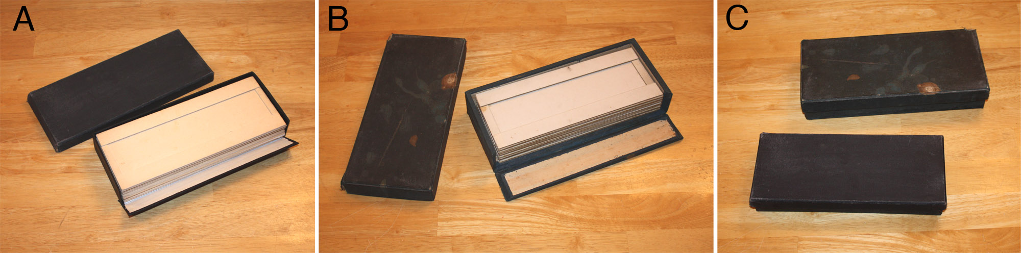 Figure 3. Two later derivatives of the horizontal microscope slide box, ca. 1950. The front panels of both drop down, following Piper’s plan, but have completely removable lids. The trays do not have dividers to separate slides. (A) A 54 slide cabinet (6 trays holding 9 slides each), made completely of cloth-covered cardstock, with card trays. (B) A 54 slide cabinet (6 trays holding 9 slides each). The trays are made of cardstock, the box is made of cloth-covered wood, with a cloth hinge for the drop-front. The lid is cloth-covered card. (C) Both cabinets closed.