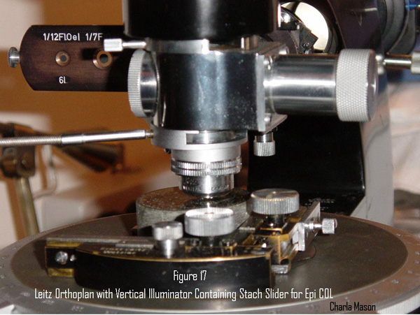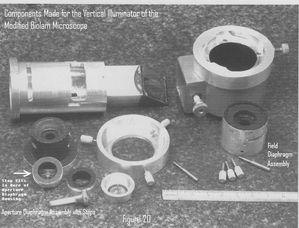 My career as a metallurgist was spent using the reflected light microscope. I learned about improving contrast in reflected light from with COL (annular brightfield) from the old books in the metallography laboratory. These included the previously mentioned Kodak book on photomicrography and a book on metallographic practice by George L. Kehl.7 This technique was no longer used by metallurgists at the time I started my career. The vertical illuminator for the Leitz Orthoplan was available with a Stach slider of stops to improve brightfield contrast of low reflectivity sections of coal. Charla Mason sent me the photograph for Figure 17 showing the Stach slider installed in her Orthoplan. The invention of antireflection coatings for the microscope lenses provided enough contrast improvement to make the method obsolete for most applications. Costly DIC now handles the low contrast opaque specimens. I designed the reflected light illuminator for my Biolam so it included COL capability to satisfy my curiosity about its usefulness with antireflection coated optics.8 My modified Biolam with the reflected light (epi) illuminator is shown in Figure 18. An operating ray diagram for the illuminator is shown in Figure 19. The illuminator and mating housing made for the Biolam are shown in Figure 20. The internal components of the illuminator are shown in Figure 21. Figure 22 is a close-up view of the illuminator after installation on the Biolam. The illuminator can be used with either ½ “or ¼” fiber-optic light- guides. The larger size is intended for darkfield with metallurgical objectives having both capabilities. The ¼” light-guide is more convenient to use because the COL stops can be quickly installed inside the adapter bushing over the end of the smaller light-guide end shown in Figure 23 without removing the aperture diaphragm assembly to install a stop on the other side of the diaphragm.