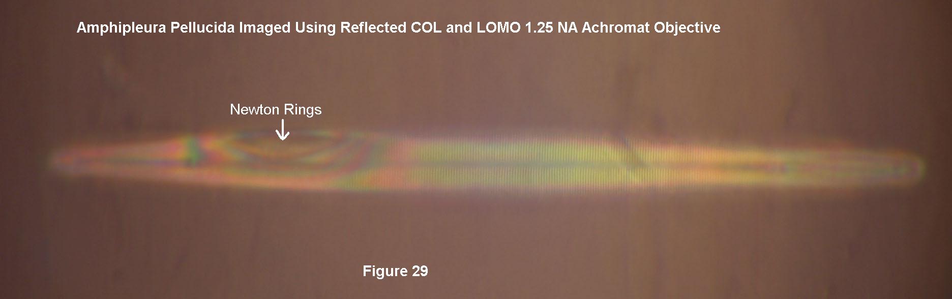 Since I was aware of use of polarized COL for the reflected light contrast mechanism of Ploem, I decided to determine whether I could resolve Amphipleura pellucida diatoms in a strew slide obtained from Klaus Kemp. I used the LOMO 90X 1.25 N.A. biological objective with reflected COL. I was surprised to see that the striae were resolved with higher contrast than with transmitted COL and the more highly corrected 1.30 N.A. apochromat, compare Figure 28 with Figure 6. The darkened background was expected based on the Ploem article. What I did not anticipate was the interference microscope effect evidenced by the color bands in Figure 28. There is a reflection of the illumination from the interface between the underside of the cover glass and the mountant which can interfere with the light diffracted from the diatom surfaces in contact with the cover glass. The diatom is nearly parallel to the cover glass interface in Figure 28, giving rise to the interference color bands. The diatom in Figure 29 is less well aligned, giving rise to the colored Newton rings.