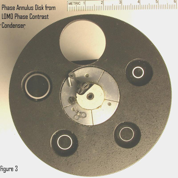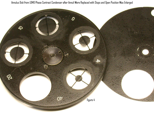 My first awareness of COL resulted from an e-mail interchange with a physiologist in the mid-nineties from whom I learned about reflection contrast to reveal details in live tissue with the reflected light illuminator for the Leitz Orthoplan as described by Ploem.4 He encouraged me to try what I now call COL in transmitted mode with my upgraded student microscope. I had already been experimenting with darkfield to reveal detail in live organisms in lake water samples. I was pleasantly surprised at the great increase of contrast over solid cone brightfield, even with the illumination N.A. reduced to less than half that of the objective. This experiment was done with my modified Monolux student microscope with a fiber-optic light illumination system and home-built condenser. My second student microscope is a LOMO Biolam, also equipped with a fiber-optic source illumination system. The Biolam came equipped with an Abbe condenser. I soon purchased the aplanatic condenser and phase contrast optics for the Biolam. In order to rapidly switch between different illumination modes, I designed and built a multi-mode illuminator for the Biolam using the 1.25 N.A. Abbe condenser with the base from a Lomo phase contrast condenser. The annuli in the wheel were replaced with darkfield stops for the 4X through 40X objectives, with the same stop for darkfield with the 4X objective used for COL with the 40X 0.65 N.A. objective. This condenser is shown in Figures 1-4. The testing of this condenser was done with the Klaus Kemp 8 Form diatom test slide. The main emphasis was imaging Pleurosigma angulatum with the 40X 0.65 N.A. LOMO achromat objective with brightfield, darkfield, oblique, and COL illumination. Resolving this diatom is a common test for a 40X 0.65 N.A. objective. The study included comparisons with brightfield and COL illumination using the LOMO aplanatic condenser. White light was used for the experiments and the digital images were not contrast adjusted with PhotoShop. The photomicrographs were recorded with a Nikon Coolpix 995 camera. This study is described in my Modern Microscopy web article.