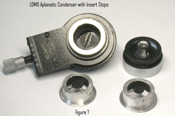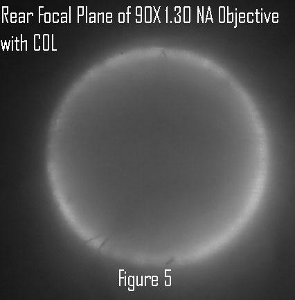 My next use of the diatom test slide was with the LOMO cardioid darkfield condenser and 1.0 N.A. 60X and 1.30 N.A. 90X apochromat objectives formerly available for the Biolam. This time I had the new Olympus E-330 DSLR camera, which I bought for photomicrography because of its 10X live view feature for critical focusing.5 The N.A. claimed by LOMO for their cardioid condenser is 1.2. Since the Biolam and its optics are based upon earlier Zeiss designs, I assumed the condenser N.A. was 1.2-1.3 before I purchased it. This assumption proved to be correct when I saw the annular ring of COL at the rear of the 1.30 N.A. objective, see Figure 5. The striae of the diatom Amphipleura pellucida were well resolved using white light and the cardioid condenser COL, as shown in the grayscale image of Figure 6. As expected, the cardioid illuminator gave excellent darkfield illumination with the diatom test slide, with the diatom Frustulia rhomboides resolved in darkfield but Amphipleura pellucida. I made stop inserts for the LOMO aplanatic condenser for experiments with high N.A. darkfield and COL, see Figure 7. I was surprised to find that I could resolve the striae of Amphipleura pellucida with the 1.0 N.A. 60X objective using COL, but only slight indications of striae with darkfield from the cardioid condenser. The aplanatic condenser was immersed with glycerin held in an immersion fluid retention ring over the front element of the condenser. The evidence of resolving Amphipleura pellucida with the 1.0 N.A. objective and COL is shown in Figure 8 for comparison with the darkfield image in Figure 9. The annular COL at the rear of the objective is shown in Figure 10.