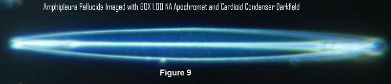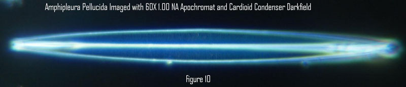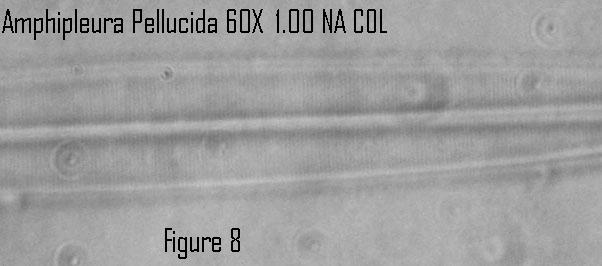 This was the first time I realized that resolution in darkfield could be lower than in brightfield. This has been known for a long time. The COL brightfield, with an outer N.A matching that of the objective follows Abbe’s theory, with the zero and first order diffracted beams within opposite edges of the exit pupil of the objective. Minimum spacing resolved = 0.50 x wavelength/N.A. Abbe’s theory requires at least two diffraction orders to pass through the objective. Martin noted that the N.A. of the darkfield illumination would have to be three times that of the objective for first and second diffracted diffracted orders to enter the objective in order to match the brightfield resolution.6 Martin notes that the resolution with darkfield illumination just exceeding the N.A. of the objective should be “that characteristic of a central beam of very small aperture, so that the performance in resolution will be expected to be much inferior to that obtainable with a full cone of direct illumination.” I believe that the loss in resolution is far less than anticipated by the Abbe theory. The resolution for a 1.00 N.A. objective is 0.27 micrometers with COL according to the Abbe theory and 0.33 micrometers according to the Rayleigh theory for self luminous objects using .550 micrometers wavelength. Thus it is not surprising that this diatom was resolved with COL but not clearly with darkfield illumination. Since this diatom strongly scatters the blue part of the white light illumination in darkfield, the resolution may be about 0.27 micrometers using .450 micrometers for the wave length in the Rayleigh equation. Although I was unable to resolve Amphipleura pellucida with the 1.0 N.A. objective with darkfield, I was able to resolve Frustulia rhomboides with the 1.0 N.A. objective and darkfield from the cardioid condenser. The listed spacing for the striae of Frustulia rhomboides is 0.30 micrometers versus 0.27 micrometers for Amphipleura pellucida. Thus I believe the Rayleigh equation for self luminous objects applies to darkfield illumination