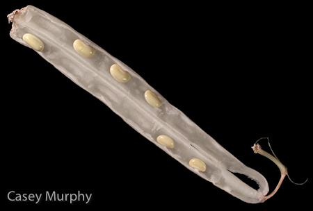 The pod of a yellow wax bean sliced open to show the arrangement of the beans. Reflected light. Captured at .5x magnification.