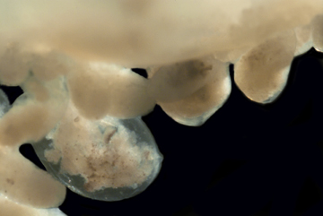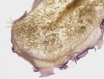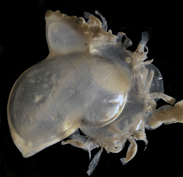 Allows the Velella to stay afloat on the waters surface. It holds the brown-like-colored polyps and air tubes. The float ranges in color from blue to purple and can grow up to 8cm in length.
