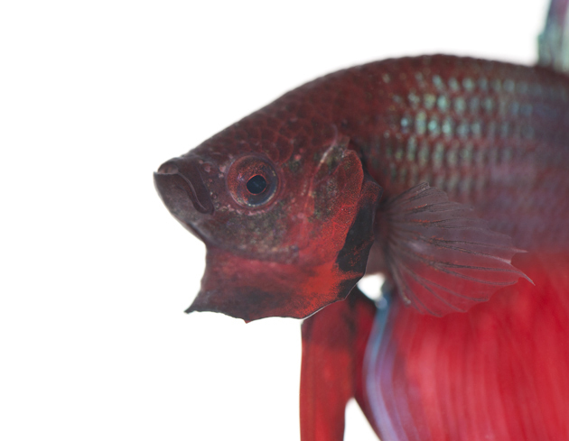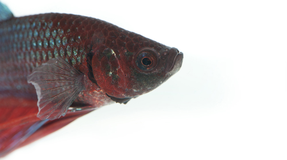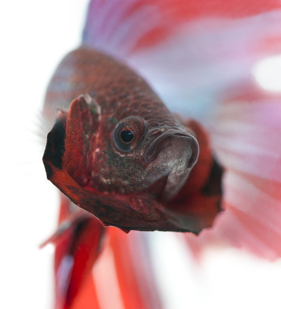 matter, breeders have turned their skills to producing fish with brilliant colors. Today, there are many different types of Siamese fighting fish. Possible colors for these fish include: red, blue, tangerine, turquoise, orange, yellow, green, cream, white, and bright blue with pink highlights. Interestingly, the blue, turquoise, and green shades are slightly iridescent. When viewed from different angles or in different lighting conditions, these colors appear to shift or change. This is due to the fact that these colors are not due to pigments on the fish. Rather, they are the result of light being refracted within a layer of translucent guanine crystals on the scales of the fish. Some breeders have even achieved patterned fish, such as marble and butterfly, and metallic shades of copper, gold, and platinum. The tails and fins of the beta can also be altered through selective breeding. Different varieties have emerged including: crown-tail, rose-tail, veil-tail, comb-tail, and half-moon.