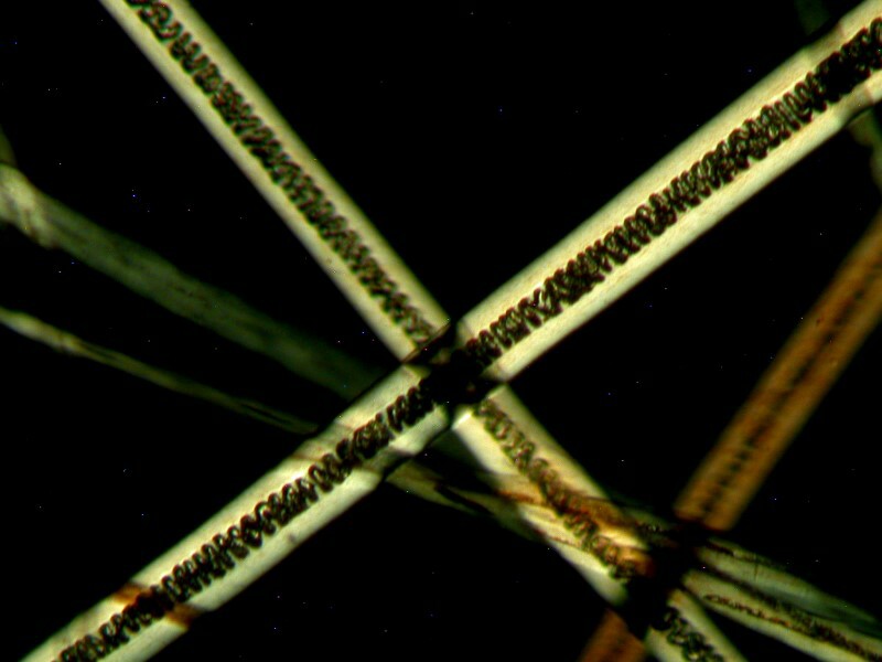 The geometric cross or 4-pointed star just off center in the image is a marvelous illustration of the crossover color shifts that one gets when hairs overlap.