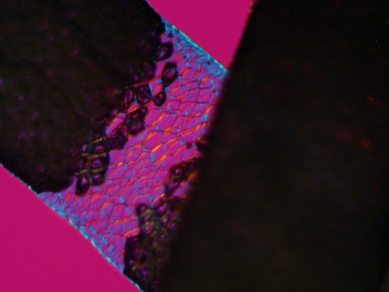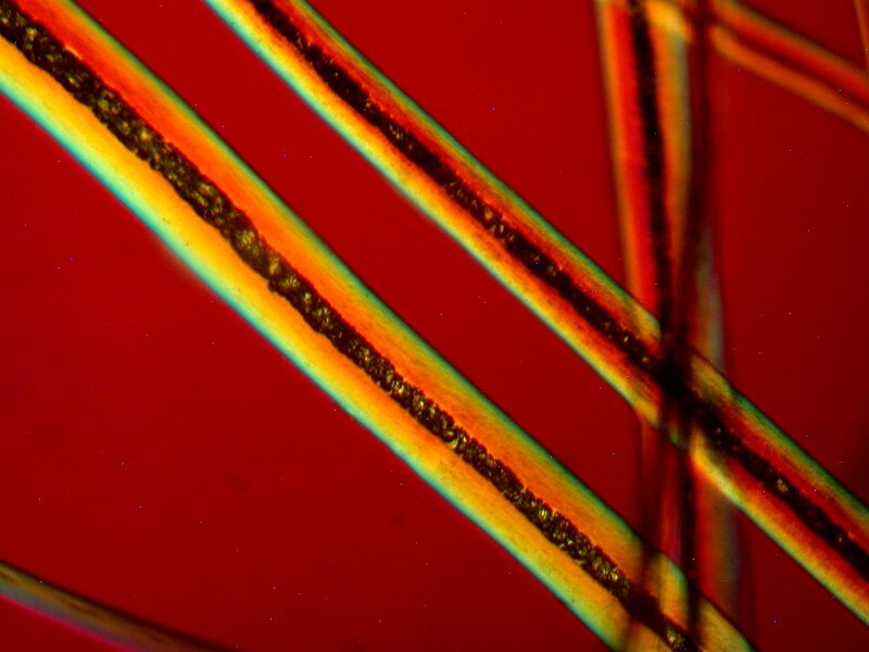Let’s begin with 2 images of Reindeer hair. Here the granulated character of the inner part is very evident in the brightfield view and the cuticle, which shows up blue, is very clear in the polarized image with the Red 1 compensator.