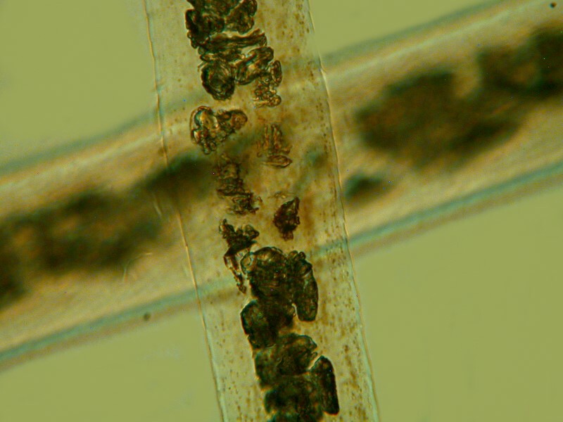 But this kind of pattern can also be found in the “filamentous” medulla, as you can see in this sample of hair from a Mouse.