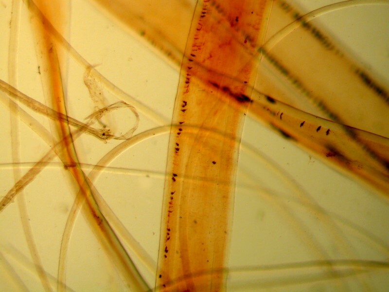 In the images below, you will notice several things: 1) a great variation in the thickness of the hairs, 2) some hairs with a dense arrangement of imbricate scales such as to obscure the medulla, 3) others where we can clearly see a “filamentous” medulla which in some instances is continuous and in others has minor interruptions or breaks.