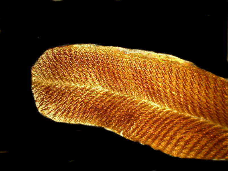 Feathers have always been especially intriguing to me because of the extraordinary variety of shapes and colors. Peacock feathers under the microscope display extraordinary characteristics both in color and morphology; individual strands can appear as though they were wound with fine, micro-thin wire and, as is the case with many structures in nature, some of the colors are pigments, whereas others are the result of refraction. The image I’m going to show you is neither very colorful nor subdivided as a consequence of its being a fossil imprint. It is a fragment of an unidentified bird. However, it does share the typical characteristics of the central shaft and attached to that are the branches or barbs.