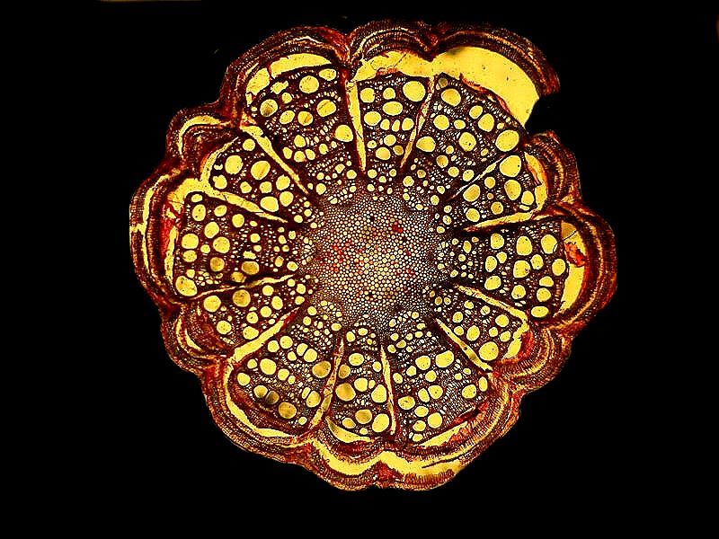 Some forms in nature are so distinctive as to be unforgettable, especially if one has tried to make ones own slide preparations of them. A case in point is cross sections of sea urchin spines. The nightmare of making such preparations is that the procedures are complex, complicated, repetitive, tedious and, if at any stage, one gets careless or simply has bad luck, a specimen can be ruined and hours of work lost. However, successful preparations are splendid and “a joy forever”. Large spines tend to be heavy and compacted and the sections are dense with calcareous material. Smaller spines tend to be less dense and, as a consequence, reveal the crystalline structure of the spine more readily by allowing us to see the spaces between the crystalline areas very clearly and unmistakably.