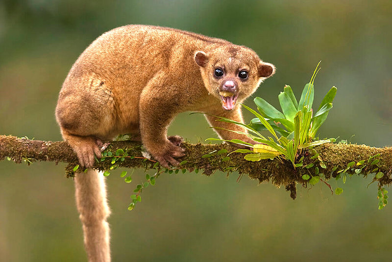 The Kinkajou is also known as a “honey bear”; they feed primarily on fruits and are partial to honey as well with the occasional bee or termite thrown in for variety. They are related to coati mundis. Kinkajous are powerful climbers and spend much time in the rainforest foraging. They can be kept in activity, but they are notorious for their ability to escape from almost any enclosure. When raised from young animals, they can be playful and entertaining. However, when startled, they can turn aggressive and inflict a severe bite. They are basically nocturnal creatures which makes them a high maintenance pet. As is so often the case, only those who have some expertise and the resources to deal with wild animals, should consider these animals as possible pets. The image below I especially like because it looks like he is sticking his tongue out at us in challenge. Perhaps because they can live to 20 or 30 years or more and are not sure you have the patience or the time to deal with them.