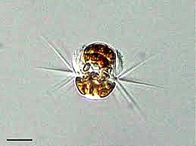 Mesodinium is a small ciliate which is common in marine and estuarine environments. The species M. rubrum can cause red tides and has been designated as nontoxic, but it can produce problems when there are intense coastal blooms.