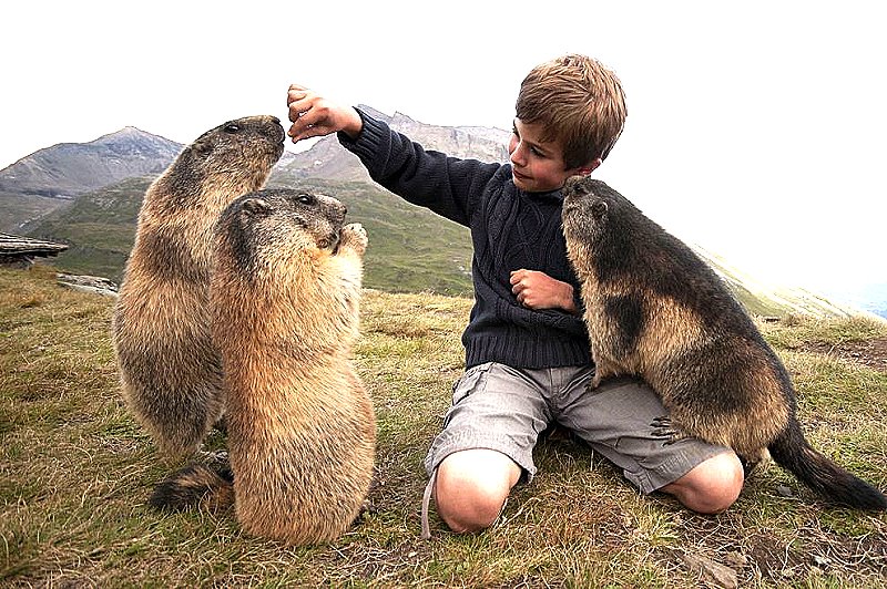 The Marmot is the largest member of the squirrel family. There are several reasons for not trying to have a marmot as a pet: rodents teeth continue to grow and so they munch almost constantly and that can be very hard on furniture. Another reason is that although they manifest friendly behavior within their own group, they are, after all, wild animals, are territorial, and see outsiders (including humans) as potential threats. Owning a marmot is illegal in the U.S. which is perhaps the strongest reason, along with the fact that the species found in Mongolia can carry Yersinia pestis, the bacterium that causes the Black Death. Nonetheless, there are instances where humans have befriended marmots, as is shown in the second image below of a 10 year old boy, who was accepted by a colony of marmots. However, this is unusual and not recommended as one can receive severe bites trying to feed these animals. So, no recommendation for these as pets–sorry.