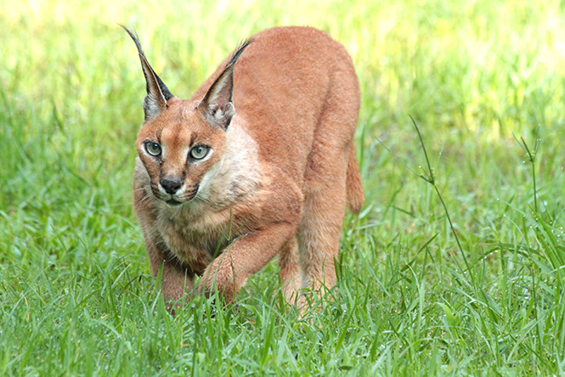 The caracal is a wild cat which lives in Africa, Central Asia and parts of India and Pakistan. It is an aggressive predator and has a distinctive appearance with its long black tufted ears. The kittens are quite charming and cuddly looking, which tempts some people to try to domesticate them. These animals, however, do not really domesticate and they are wanderers and need large amounts of space. The males average about 40 pounds and the females about 30 pounds; both can get up to about 3 feet long. They have extremely sharp and powerful teeth. There is no question about it, these are not household pets.