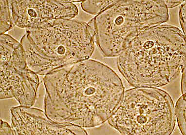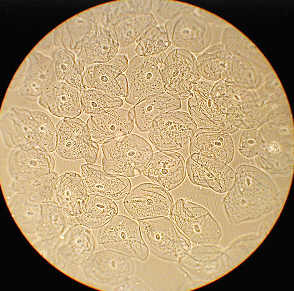 Left shows the entire field of epithelial cheek cells, phase contrast, whilst at right the same image cropped without resizing from 1280 by 960 pixels. A little more detail shown but still slightly 'empty'.