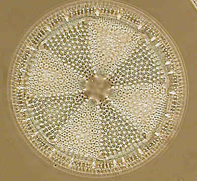 Here the first image used a restricted microscope condenser diaphragm setting to give a little diffraction colour to make the lowish resolution image of more interest. The second is a cropped image from the original unsized 1280 by 960 image of Actinotychus heliopelta, using a times 40 phase flourite objective. Notice the fine dot detail is missing, which is clearly visible with direct vision, and could have been revealed in the CCD image with a higher power eyepiece had I possessed one.