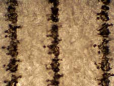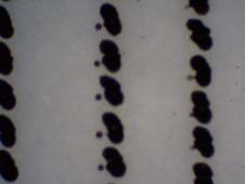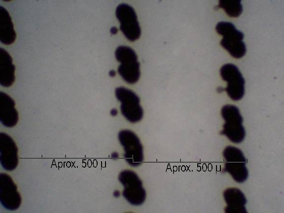 The file was laid out to match the Avery 5890 mailing labels, but plain or photographic paper works well. I found the paper is thin enough that enough light is transmitted through it to get a decent image. Chitchai suggests photographing the micrometer and using it as a ruler for measuring other pictures. You may want to modify this step; as even with the best of printers, with much magnification the grid will be a ragged scattering of ink drops, and not a sharp line (see images below). As an alternative, take several pictures of different portions of the grid, then using your favorite drawing software, create a ruler that has sharp lines based upon average measurements from these pictures. I zoomed in on the images, and counted the pixels between lines, then made my ruler based upon the pixel count. If you make the background transparent, this ruler can simply be overlaid on any other images taken at the same settings.