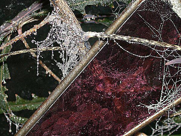 However, for opportunistic microscopists such as myself, what most people regard as mere nuisances, can be transformed into fascinating and puzzling objects of study. In our dining room window, I have a tall spindly specimen of False Aralia (Dizygothea elegantissima) which, as it turns out, is infested with Brown Scale Insect (Kilifia sp.). For those of you who have not had the pleasure of making its acquaintance, it is, I assure you, bizarre enough to have come from some planet circling Betelgeuse. It looks rather like a brown scab; it is flattened and ovoid and it has rather small weak legs relative to its size when an adult. Its mouth parts bore into the leaf vein, or stem to feed on the sap and they must be quite sharp to penetrate the tough layers of the stem or the rather resilient epidermis of the leaves. These insects are feeding and breeding machines. They excrete what appears to be a sort of sticky, clear resin that sometimes forms sizeable globules. In some instances, after sitting a while, part or all of the globule will turn an opaque, milky white. Sitting in the window next to and sort of entangled in the False Aralia is a metal and stained glass sculpture which I bought my wife many years ago as an anniversary present. In the image below, you can see how these resinous globules have formed what appears to be a network very much like a web.