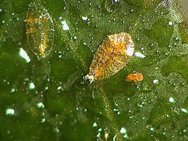 Once an adult female settles in, she almost always remains in that spot and begins to produce eggs. The males are apparently very small and can fly, but I have not yet been able to locate any. The female produces eggs under the protective cover of her tent-like body and they hatch while still under her body. When they are hatching, there are odd triangular bits of white fluff all around the hatchlings which begin to crawl out from beneath their mothers to find a place of their own to feed. These “crawlers” rarely go any significant distance from their mothers, but they do appear to go through at least 2 stages before settling to feed. Here are 2 images of the hatchlings.