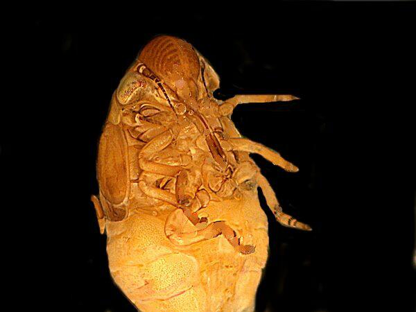 For several summers I have noticed on the juniper bushes along the walkway up to our house that spots of white foam about the size of a dime appear on many of the branches. So, last summer I finally got around to investigating. I knew it was some kind of insect but, since they never did much damage to the junipers, I had ignored them. I cut small bits of branch into a plastic dish, so that I could leave the foam environment as undisturbed as possible. In my lab, I transferred one of the pieces into a small Petri dish and carefully began to scrape away at the foam to see what lay beneath—and “what to my wondering eyes should appear...”, well, I assure you it wasn’t St. Nick and 8 tiny reindeer. This thing looked like a baby out of the movie Alien.