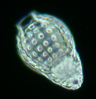 These two images of a Radiolarian have been cropped from a small area from the centre of two medium power DF images with the image right having the diffusing effects of a ground glass sheet exactly as the first examples above. The purpose of showing these is to demonstrate rather more critically that there are no material disadvantages in using a diffusing screen in DF. The exposure levels for the camera were obtained using its spot metering facility which enabled fairly consistent imagery. Notice that all the internal prismatic effects of the specimen's structure are virtually identical in these images. ( Radiolarian. x20 Wild Plan Fluotar objective )