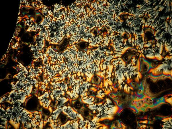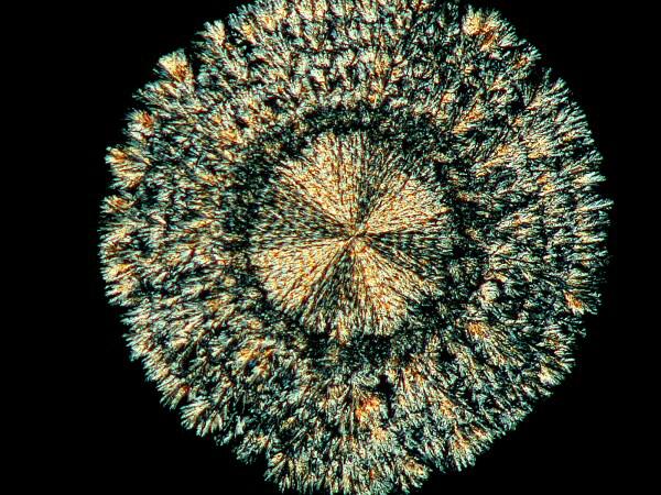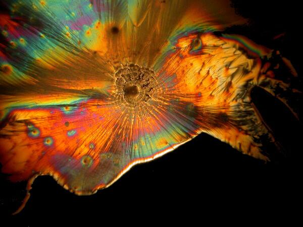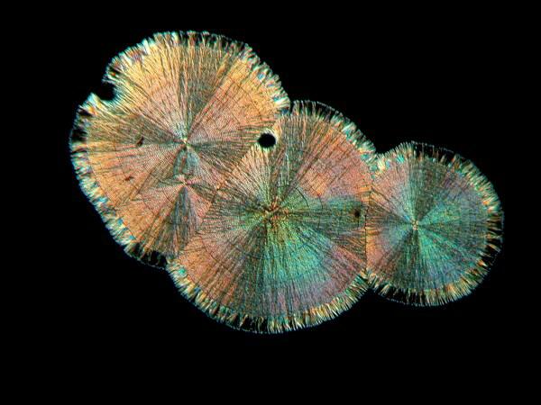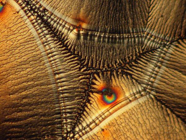 1) Concentric circles of “rings”. This is one of the loveliest and most striking features of ascorbic acid. These rings pop up in a variety of contexts and may, even under polarization, be essentially monochromatic but, far more likely, will be filled with vibrant, pastel colors. In imaging these crystals, it is important to remember that there is a strong correlation between illumination intensity and color saturation in the image.