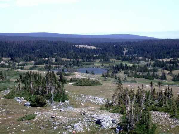 It was a bright, pleasant summer day, but we estimated that the winds must have been 40 mph and some just nearly blew me over as we climbed up to the platform. I was very glad there was a railing to hang on to. The altitude here is 10,847 feet and there are splendid views down into Colorado and over to the west, views of the Sierra Madre mountains along the Continental Divide.