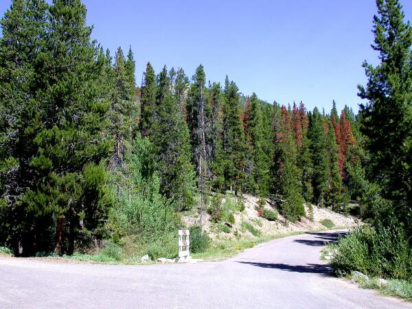This year, however, I was rather saddened. There were a significant number of fir trees which were dead and all of the needles had turned from their usual lovely forest green color to an horrific reddish-brown. They were victims of pine beetle. To the south of us, down in Colorado, staggering numbers of evergreens have been killed by pine beetle, radically increasing the danger of wildfires. The beetles burrow beneath the bark, but they also carry a blue stain fungus which infects the trees. Female beetles release phenomones which attract enormous numbers of other beetles. The trees try to defend themselves by increasing the release of resin to ensnare the beetles, but the blue stain fungus can suppress this defense. In the image below, you can see several dead tress and a bit lower down on the mountain, we saw even larger numbers of dead trees.