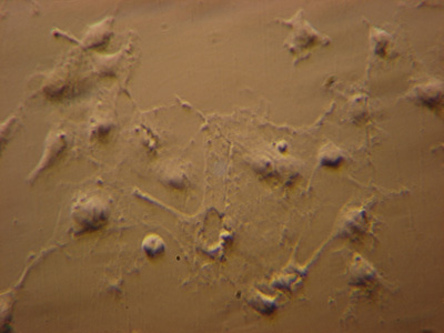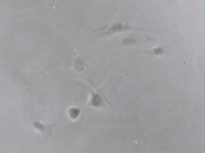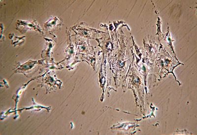 Human cheek epithelial cells in aqueous mounts are a classic demonstration of the value of contrast enhancement techniques. But, suspect like others, I found the BPAE endothelial cells only barely visible with phase, oblique, COL and even DIC. A typical image with phase is shown later next to the same field of view under fluorescence, parts of some cells were only just seen despite the cells being present in high density.