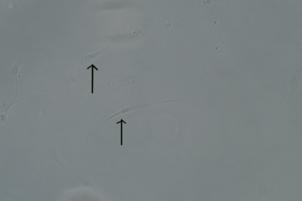 Upper image: brightfield phase with 100W halogen lamp only shows a hint of parts of the BPAE cells. DIC or oblique is no better.