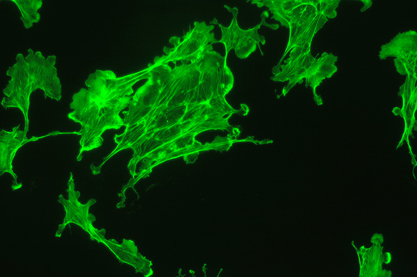 With the fluorescence microscope and 100W mercury lamp, the images are bright enough for a consumer digicam such as the Sony P200 to be supported over an eyepiece and allow it to auto expose and focus. Exposure 2 secs ISO100. The actin filaments are particularly well shown in this example. 40X objective.
