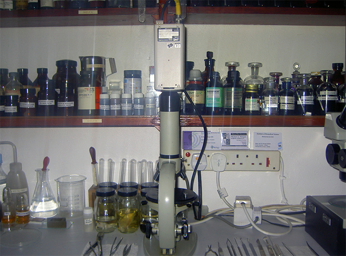 Figure 1. Russian microscope with video camera attached in my home lab.